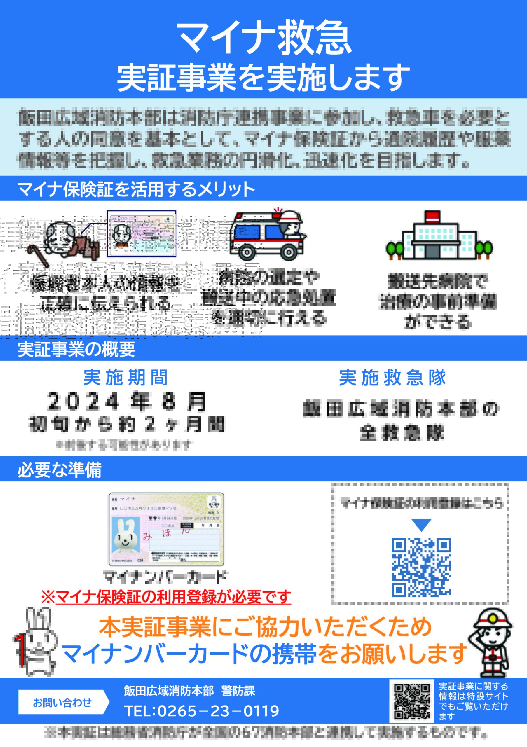 総務省消防庁連携事業として飯田広域消防本部の全救急隊が、マイナ救急実証事業を令和6年8月9日午前8時30分から実施します。